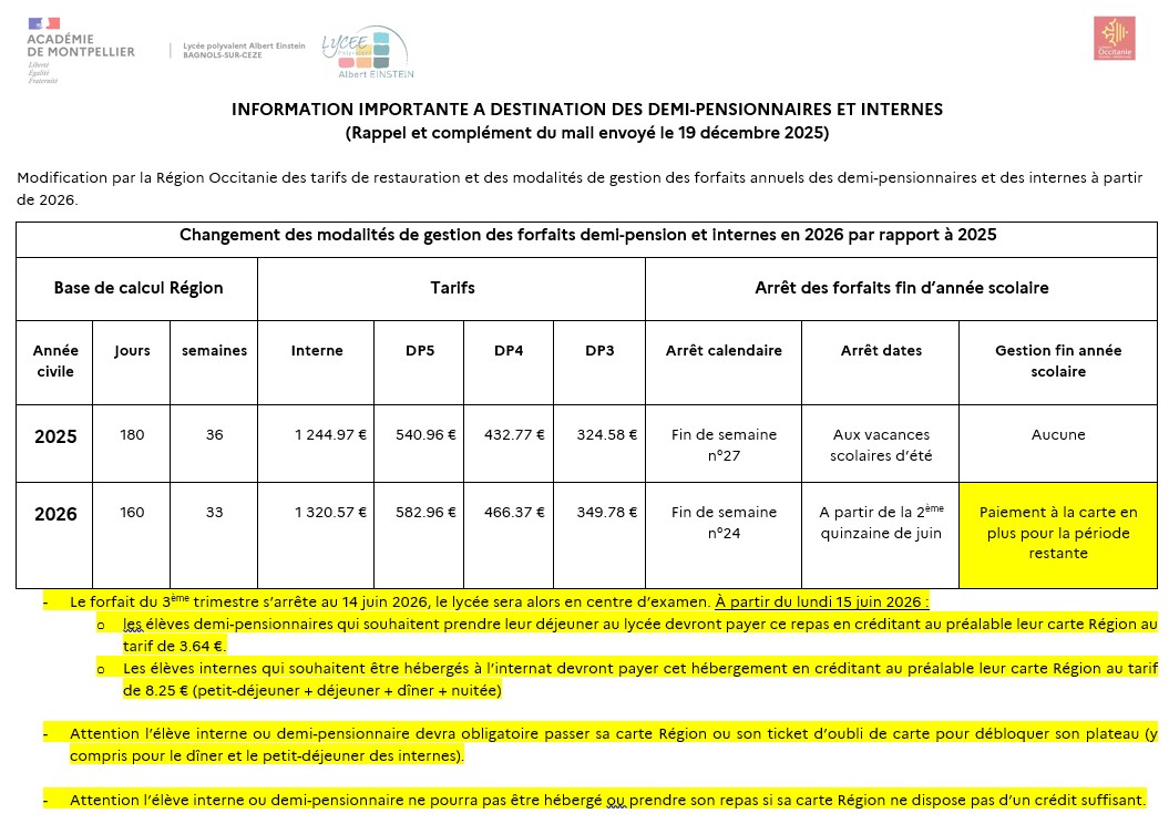 Modification par la Région Occitanie des tarifs de restauration et des modalités de gestion des forfaits annuels des demi-pensionnaires et des internes à partir de 2026.
