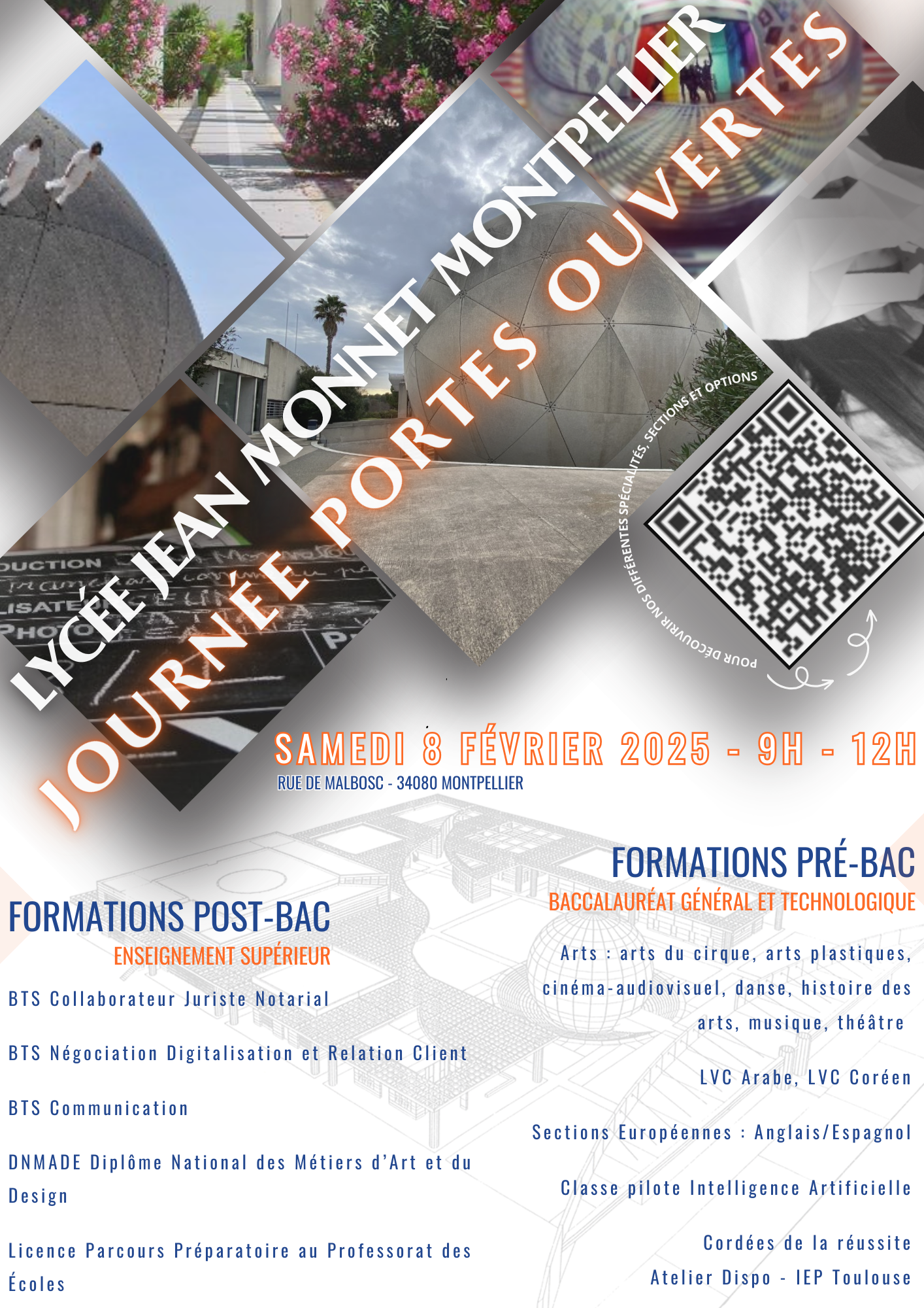 | Lycée Jean MONNET de Montpellier | Les Portes Ouvertes du Lycée Jean MONNET ont eu lieu le samedi 8 février 2025 de 9h à 12h. Les personnels, les élèves et les étudiants du lycée Jean MONNET vous accueillaient pour vous présenter notamment tous les enseignements artistiques. Affiche en PJ (bas de page). |