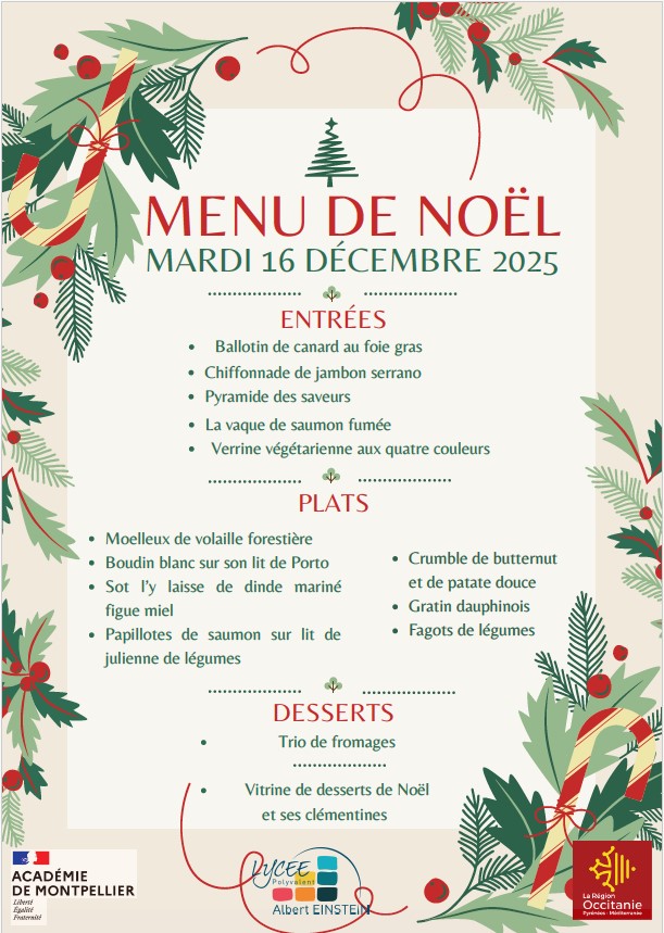 Le repas marquant le début des festivités de fin d'année se tiendra le mardi 16 décembre 2025 au restaurant scolaire du Lycée Albert Einstein. N'oubliez pas de réserver avant le 10 décembre !